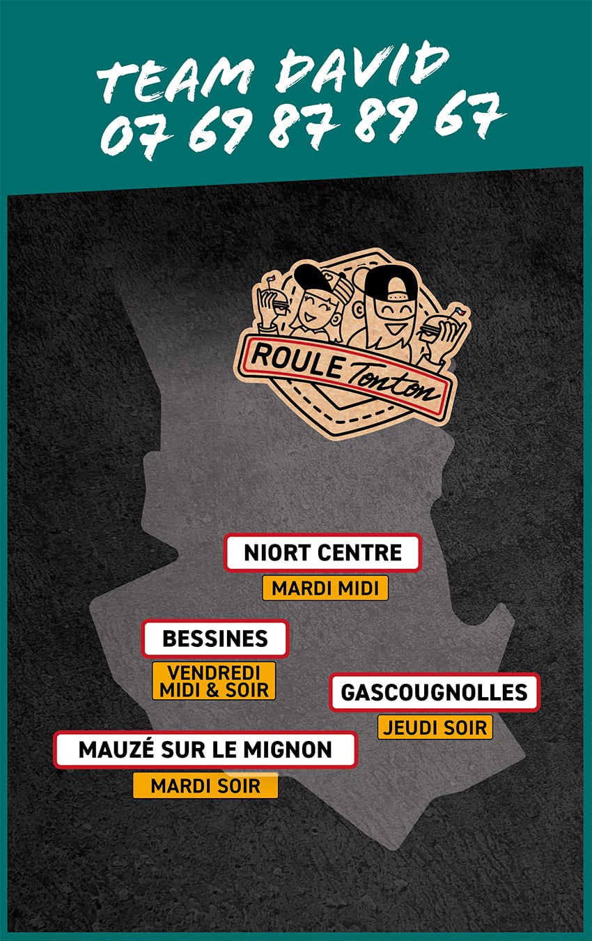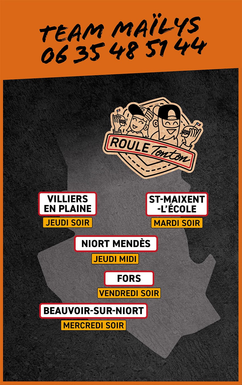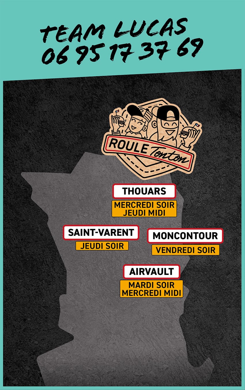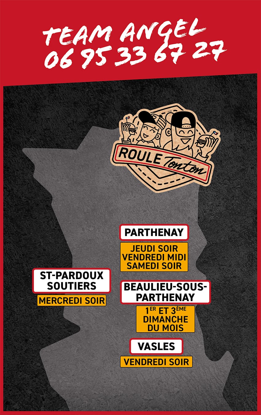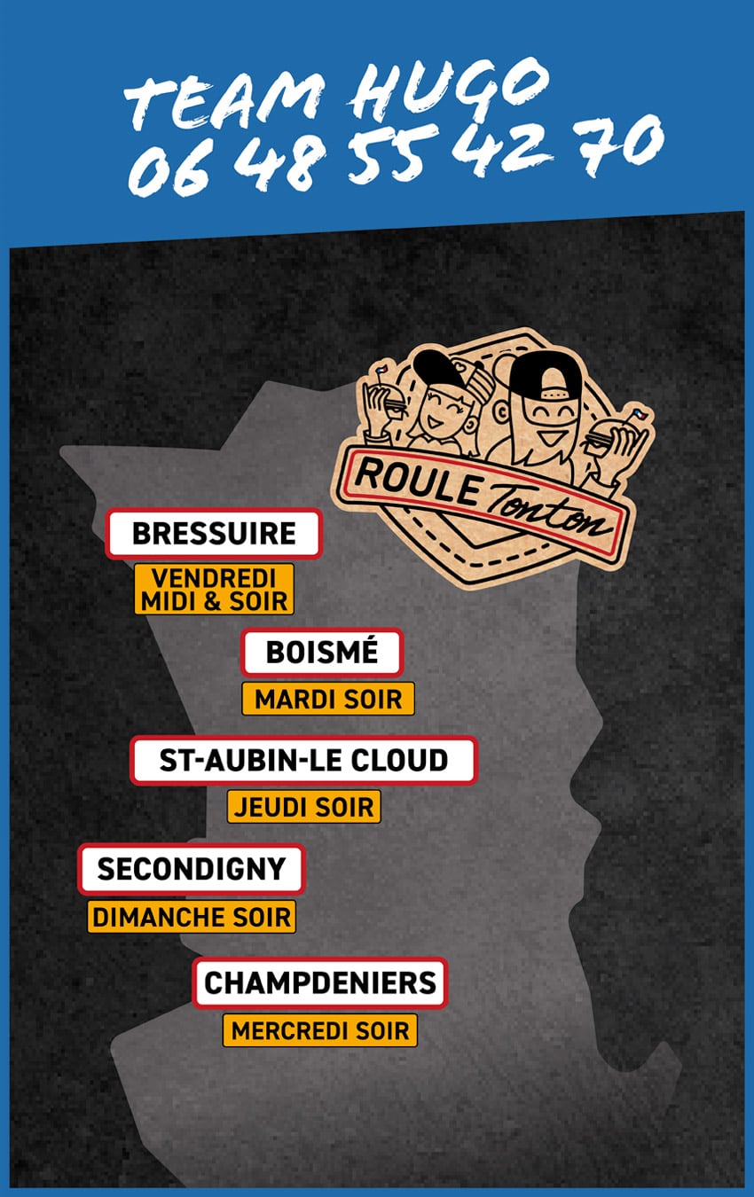 Roule Tonton, mais si tu connais, c’est le p’tit gars Alex qui arpente les routes du 7.9., avec sa fameuse remorque noire estampillée « Burger Van » depuis 2010. Et en 2020, il s’est mis à dépasser les frontières de la Gâtine avec son pote Hugo pour s’exporter en particulier vers le bocage Bressuirais. Bref, Burger Van a un nouveau nom… c’est ROULE TONTON !